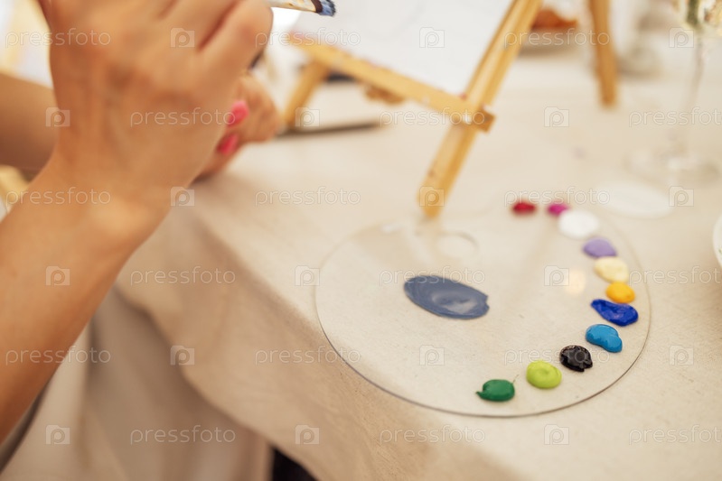 Крупный план женских рук и палитры с красками. Художница держит кисть и смешивает акриловые краски. Женщина рисует на холсте за мольбертом за столом в мастерской