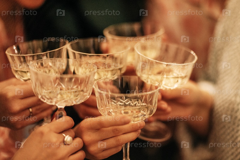 Крупный план мужских и женских рук с элегантными бокалами шампанского. Мужчины и женщины произносят тосты с бокалами игристого вина. Друзья чокаются бокалами с алкогольными напитками. Вечеринка или встреча друзей