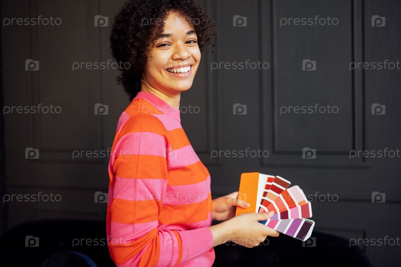 Крупный план молодой африканской женщины в красном свитере, держащей палитру цветов. Привлекательная женщина-дизайнер улыбается и выбирает цвет