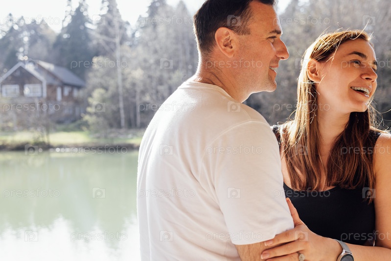 Молодая супружеская пара обнимается в беседке у озера. Мужчина и женщина смеются и наслаждаются своим отпуском вместе