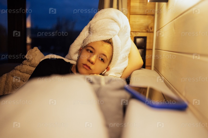 Милая девчонка-подросток после ванны лежит на кровати с полотенцем на голове и ждет телефонного звонка. Девушка грустит и смотрит на свой мобильный