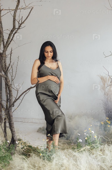 Молодая беременная женщина в зеленом атласном платье стоит на траве летом