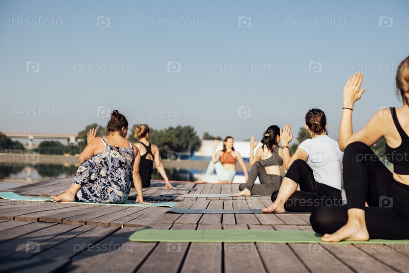 Утреннее занятие йогой с инструктором на городском пирсе. Молодые женщины садятся в позу царя рыб и делают Ардха Матсиендрасану