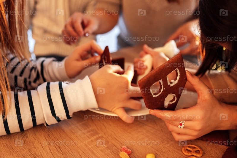 Крупный план женских рук, собирающих пряничный домик на деревянном столе. Девочки украшают рождественское печенье сладостями. Праздничное приготовление пищи всей счастливой семьей