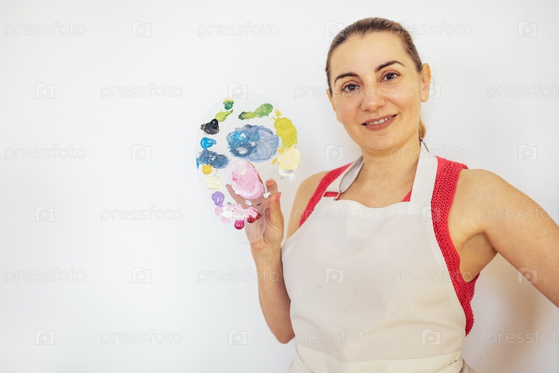 Молодая женщина улыбается и держит палитру красок. Очаровательная художница