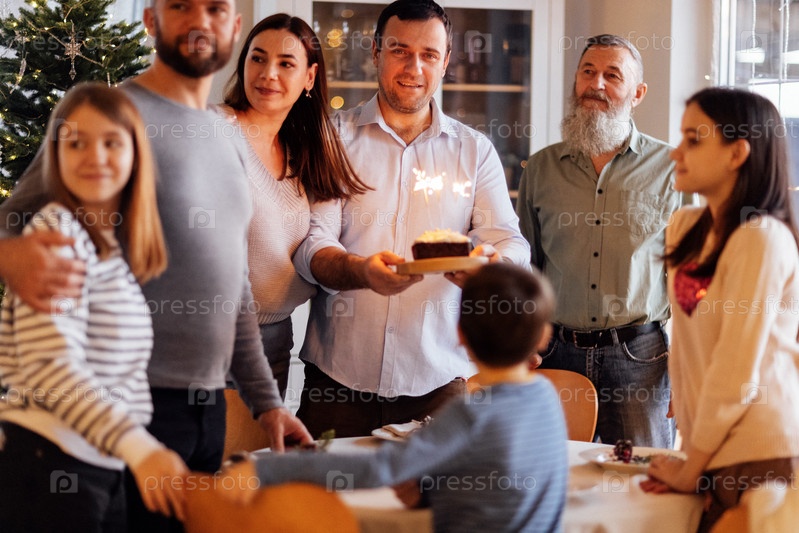 Большая счастливая семья за праздничным столом дома. Привлекательный молодой человек с тортом