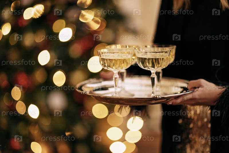 Крупный план молодой женщины, держащей в руках красивый металлический поднос с четырьмя бокалами шампанского. Новогодний ужин с алкогольными напитками. Праздничная встреча друзей