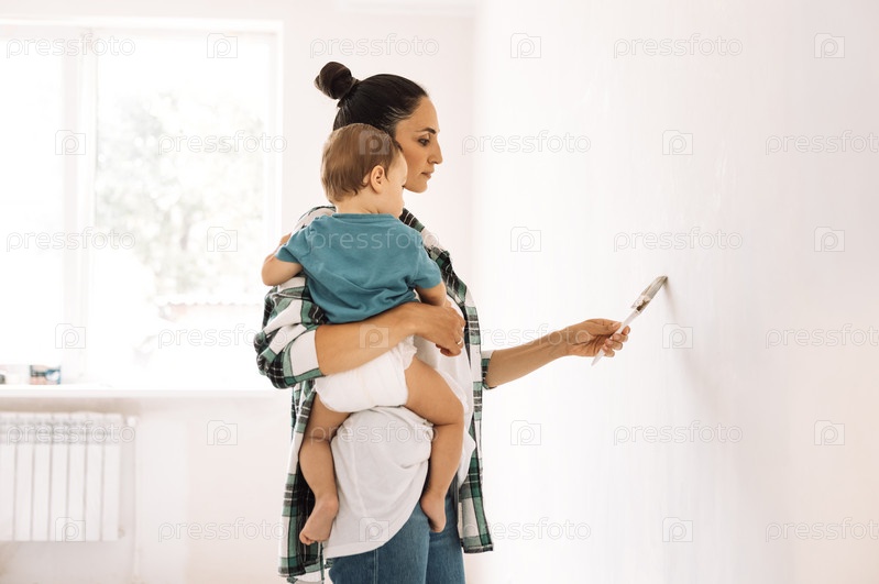 Молодая женщина держит ребенка и красит стену. Очаровательная мама с маленьким ребенком делает ремонт в квартире