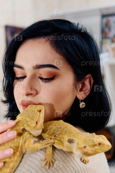 Красивая женщина позирует с двумя очаровательными питомцами — бородатыми агамами