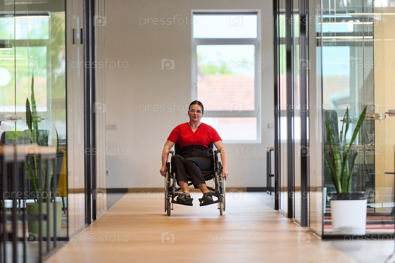Современная молодая бизнес-леди в инвалидной коляске окружена инклюзивным рабочим пространством с офисами со стеклянными стенами, олицетворяющими решимость и инновации в деловом мире