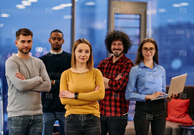 Портрет успешной творческой бизнес-команды, смотрящей в камеру и улыбающейся. Разнообразные деловые люди, стоящие вместе на старте. Избирательный фокус