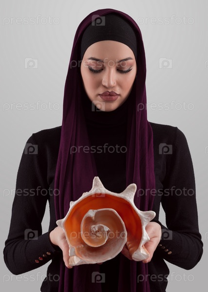 Довольно стильная мусульманка в хиджабе, держащая ракушку и мечтающая с закрытыми глазами. Золотое сечение и идеальная концепция пропорции