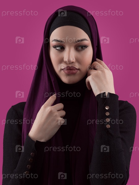 Современная мусульманка в стильной повседневной одежде хиджаб изолирована на розовом фоне. Разные люди моделируют концепцию моды хиджаб