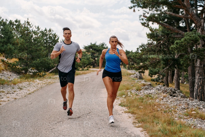 Пара в спортивной одежде бежит по живописной дороге во время утренней тренировки, наслаждаясь свежим воздухом и поддерживая здоровый образ жизни