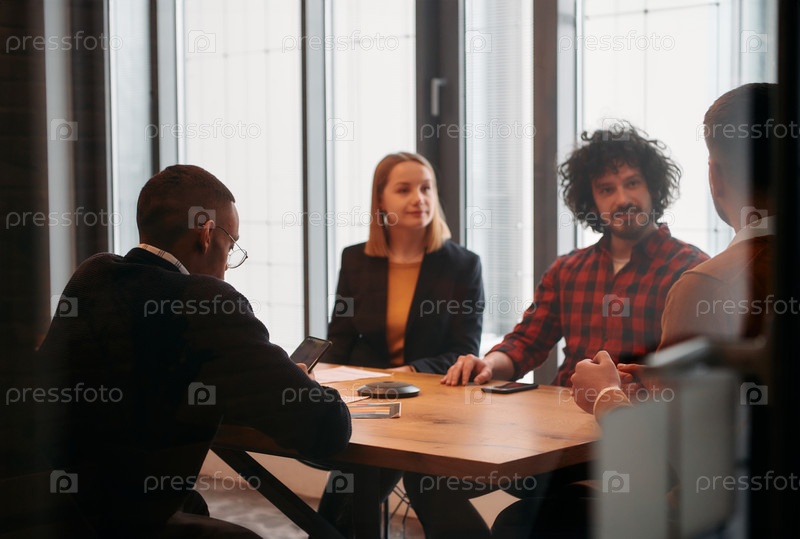 В элегантном стеклянном офисном помещении команда профессионалов бизнеса ведет оживленные дискуссии и обменивается стратегическими идеями, демонстрируя сотрудничество и инновации, лежащие в основе современной корпоративной культуры
