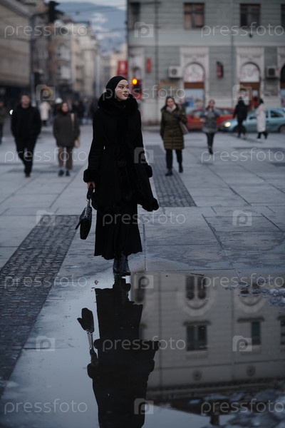 Мусульманка идет по городской улице холодной зимней ночью в хиджабе
