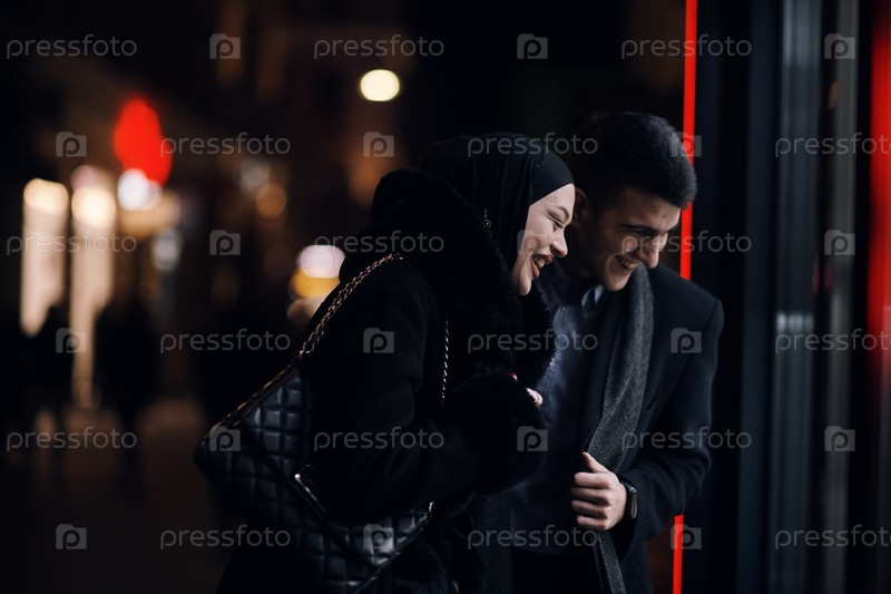 Счастливая мультикультурная деловая пара прогуливается вместе на улице города ночью возле витрины ювелирного магазина