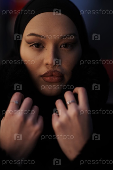 Мусульманка идет по городской улице холодной зимней ночью в хиджабе