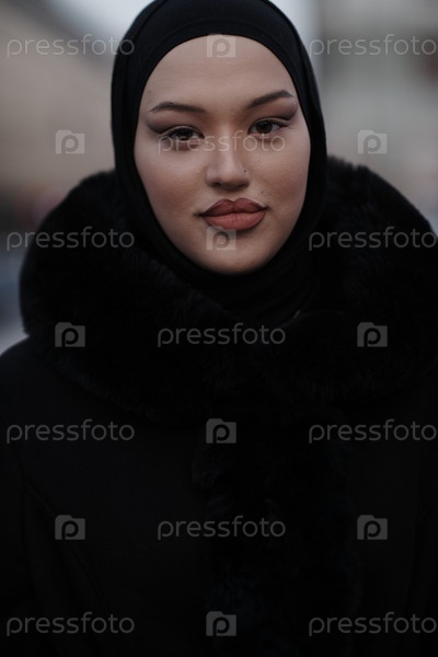 Мусульманка идет по городской улице холодной зимней ночью в хиджабе