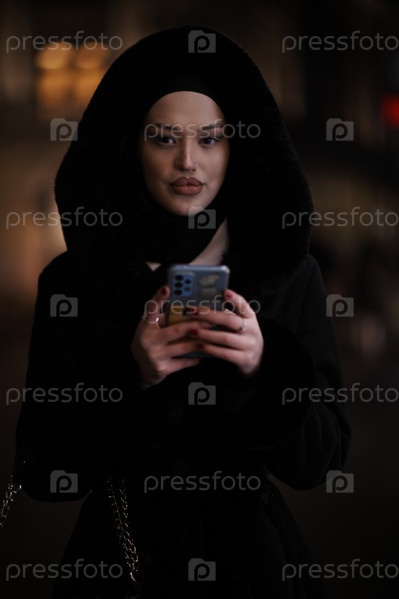 Мусульманка идет по городской улице холодной зимней ночью в хиджабе