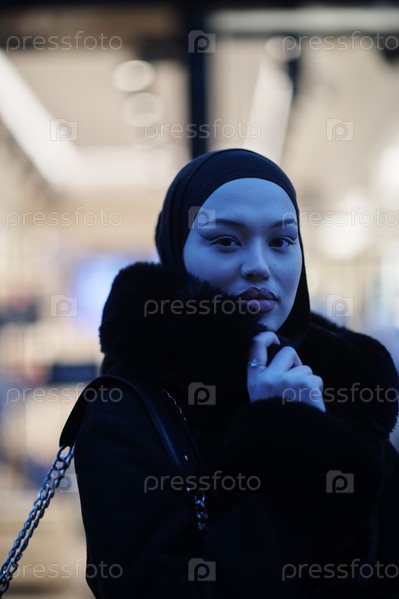 Мусульманка идет по городской улице холодной зимней ночью в хиджабе