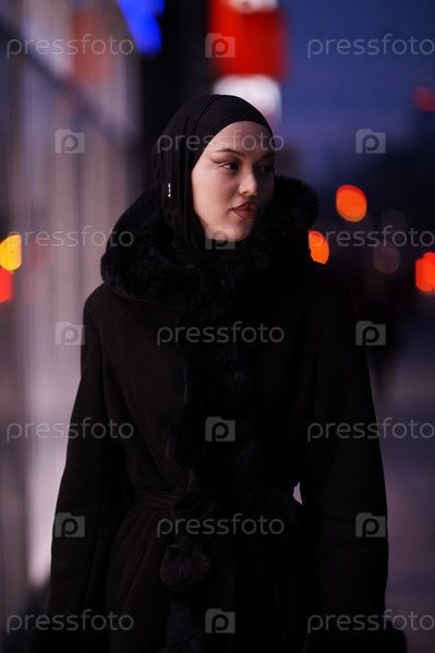 Мусульманка идет по городской улице холодной зимней ночью в хиджабе