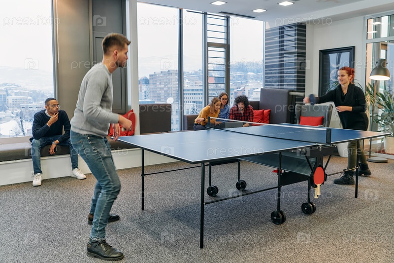 Коллеги по бизнесу отдыхают от работы, чтобы поиграть в настольный теннис, способствуя командной работе и товариществу на рабочем месте