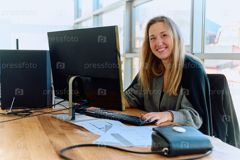 Предпринимательница, программирующая дизайн продукта для деревообрабатывающего станка в современном офисе