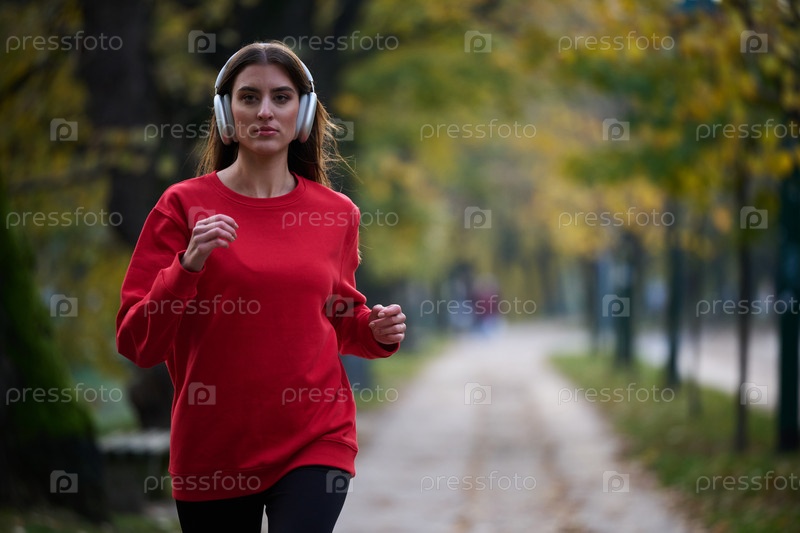 Молодая красивая женщина бежит в осеннем парке и слушает музыку в наушниках на смартфоне