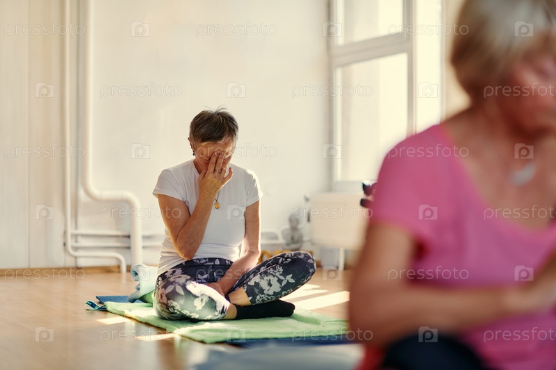 Пожилая женщина практикует успокаивающие традиционные упражнения с мягким жестом лба