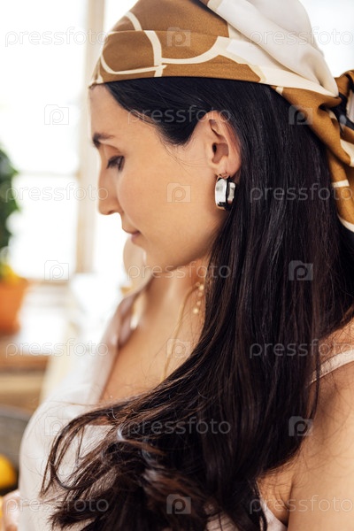 Портрет крупным планом молодой женщины в стильном платке. Профиль привлекательной брюнетки в белом платье в помещении