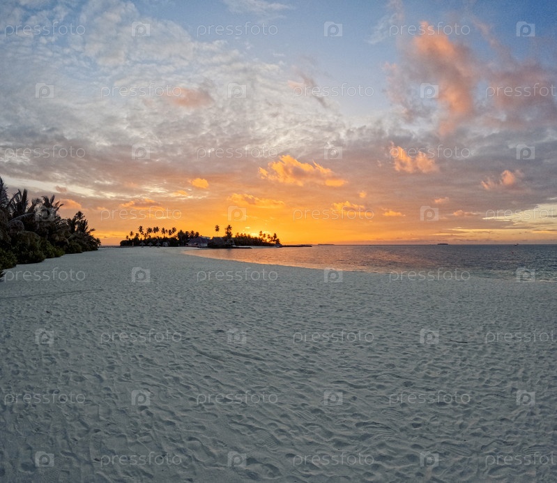 Великолепный закат на берегу океана. Яркие краски заходящего солнца и песчаный берег моря. Пустой чистый пляж и пальмы вечером