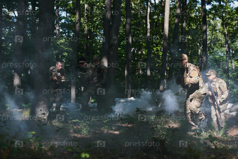Специализированное военное антитеррористическое подразделение проводит секретную операцию в густом, опасном лесу, демонстрируя точность, дисциплину и стратегическую готовность
