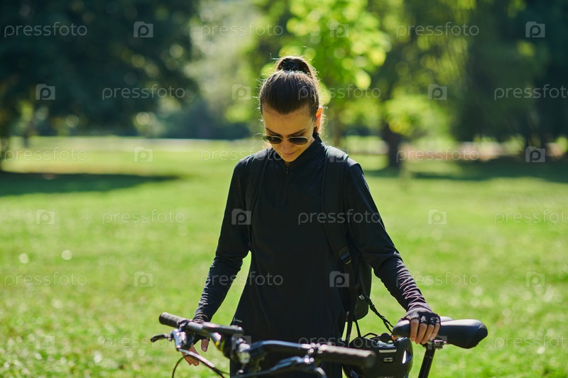 В лучезарных объятиях солнечного дня радостная девушка, облаченная в профессиональную велосипедную экипировку, обретает чистое блаженство и жизненную силу, катаясь по парку на своем велосипеде, а ее заразительный смех отражает беззаботную гармонию момента