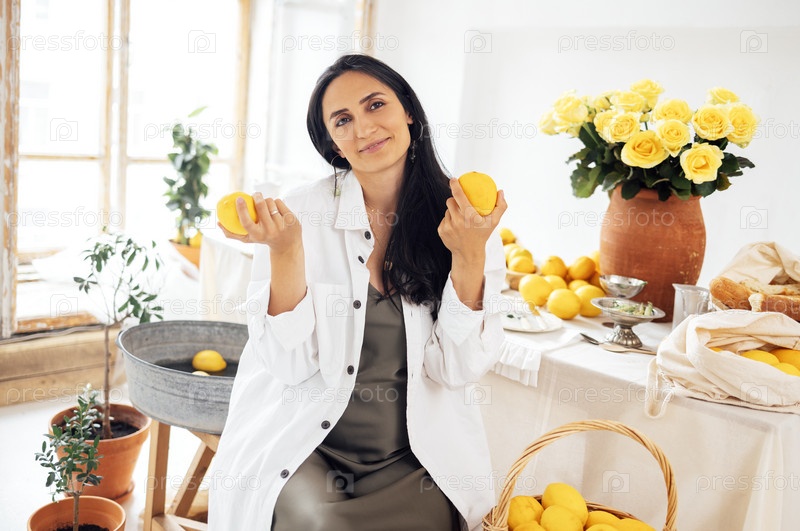 Очаровательная девушка сидит за столом и держит лимоны. Молодая беременная женщина в зеленом атласном платье и рубашке обедает в деревенском винтажном интерьере