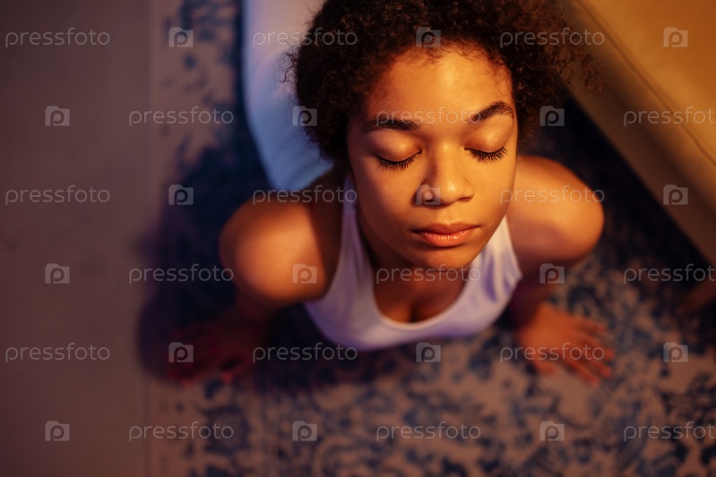 Привлекательный африканец практикует вечернюю йогу. Очаровательная кудрявая черная девушка в фитнес-костюме растягивает спину на полу в гостиной. Вид сверху
