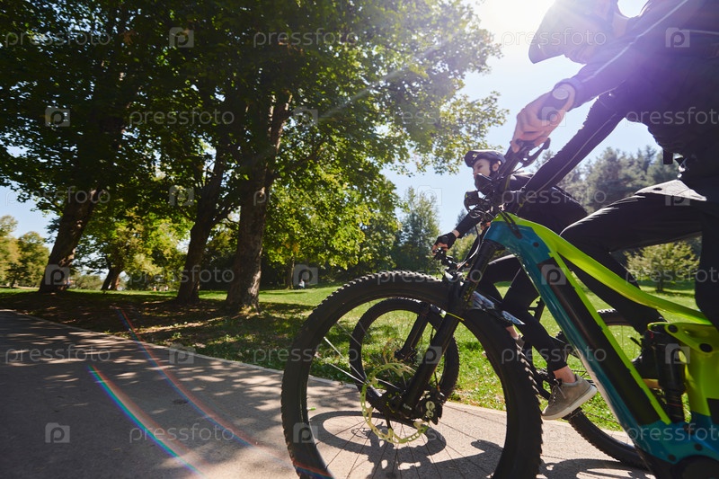Счастливая пара, одетая в профессиональную велосипедную экипировку, наслаждается романтической велопрогулкой по парку, окруженному современными природными достопримечательностями, излучая любовь и счастье