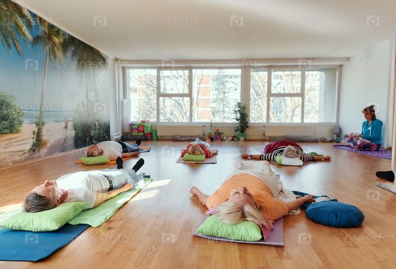 Женщины старшего возраста занимаются оздоровлением: йогой и растяжкой в залитом солнцем пространстве