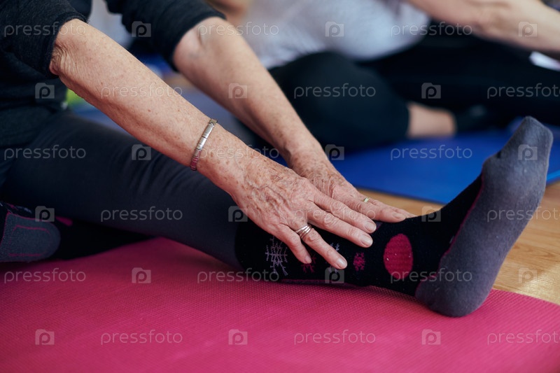 Группа пожилых женщин занимается различными упражнениями йоги, включая растяжку шеи, спины и ног, под руководством тренера в залитом солнцем месте, способствуя благополучию и гармонии