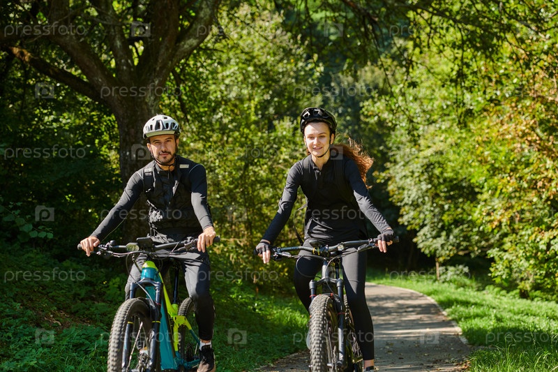 Счастливая пара, одетая в профессиональную велосипедную экипировку, наслаждается романтической велопрогулкой по парку, окруженному современными природными достопримечательностями, излучая любовь и счастье