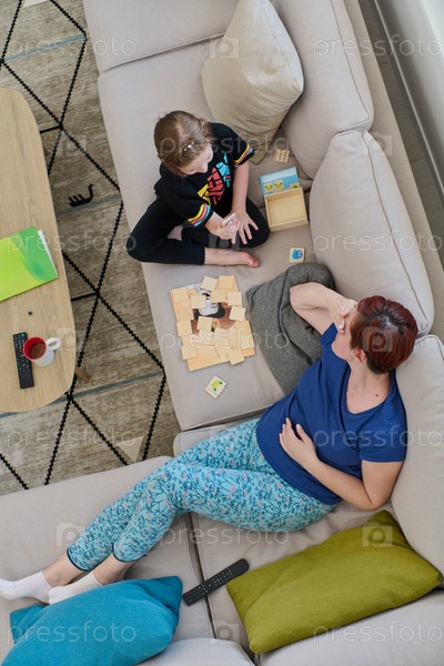 Вид сверху на мать и дочь, играющих в увлекательную настольную игру на диване дома