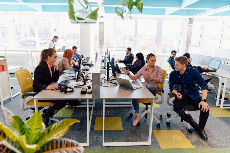 Совместный процесс многонациональной квалифицированной молодой бизнес-команды во время мозгового штурма в офисе. Разнообразная группа молодых людей, одетых в официальную одежду, сотрудничает в разработке дизайн-проекта