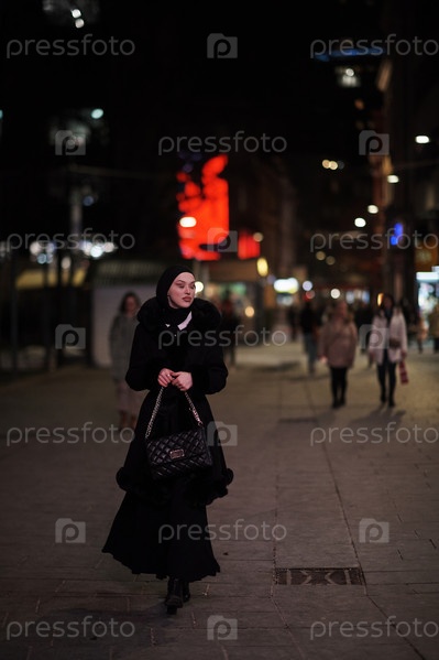 Мусульманка идет по городской улице холодной зимней ночью в хиджабе