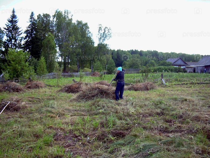 Сенокос. Пожилая женщина собирает сено в поле