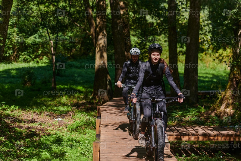 Счастливая пара, одетая в профессиональную велосипедную экипировку, наслаждается романтической велопрогулкой по парку, окруженному современными природными достопримечательностями, излучая любовь и счастье