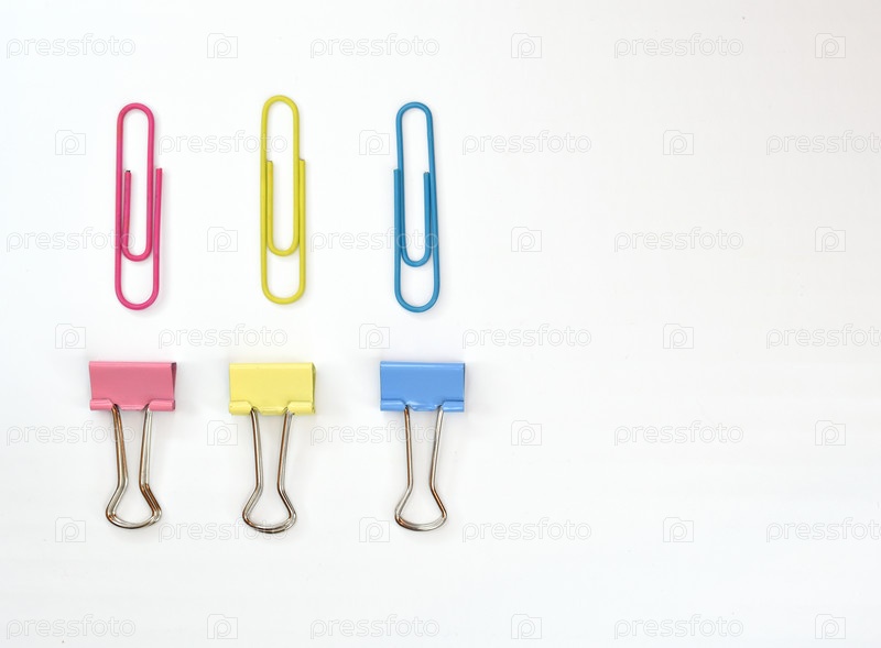 Цветные скрепки и прищепки для бумаги, выложенные в два ряда
