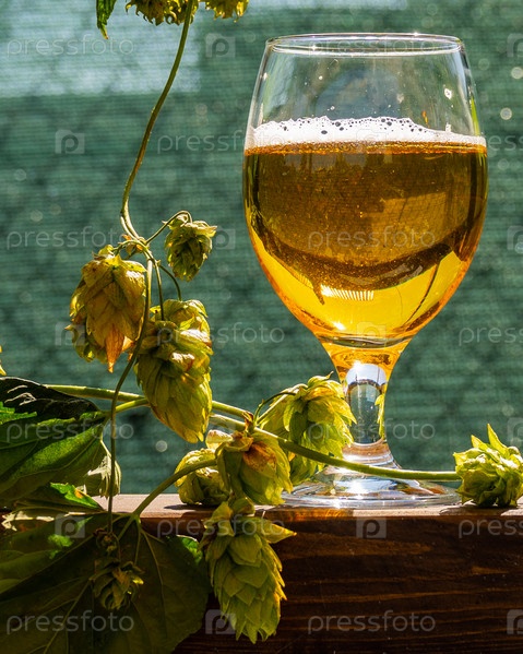 Свежий зеленый хмель с листьями и кружкой пива, стоящей рядом. Стеклянный бокал, наполненный светлым пивом и покрытый белой пеной, украшенный спелыми плодами зеленого хмеля, крупным планом