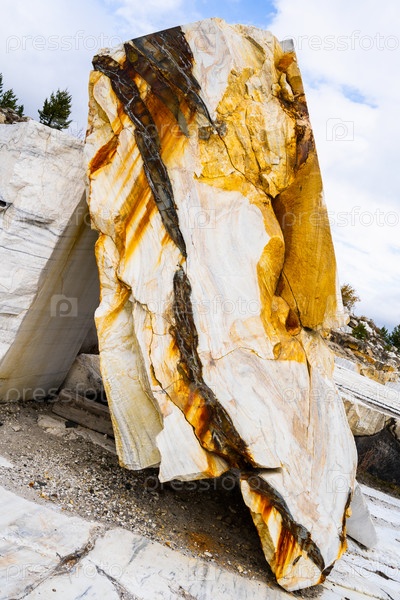 Старый заброшенный мраморный карьер. Мраморный карьер. Большие белые мраморные блоки в старом заброшенном карьере. Вид из мраморного карьера осенью. Выборочный фокус