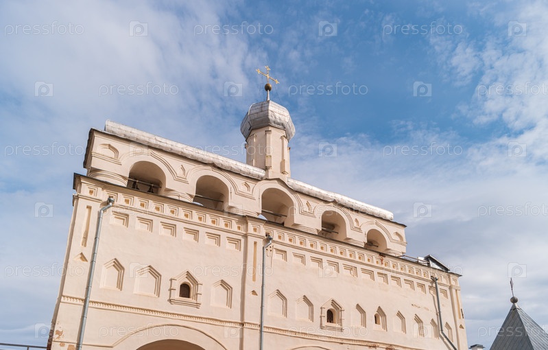 Великий Новгород, Россия. Вид на Софийскую колокольню на фоне весеннего неба. Территория Новгородского кремля
