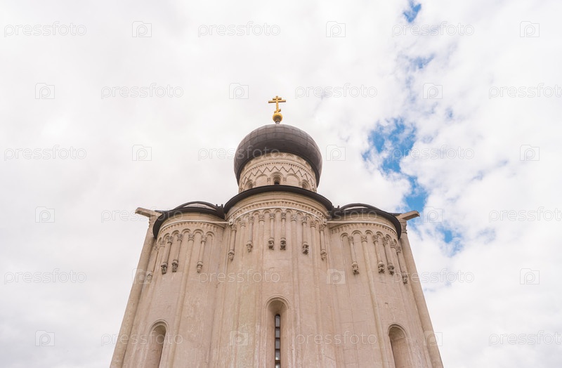 Вид фасада древней белокаменной церкви Покрова на Нерли, храма во Владимирской области России, построенного в XII веке